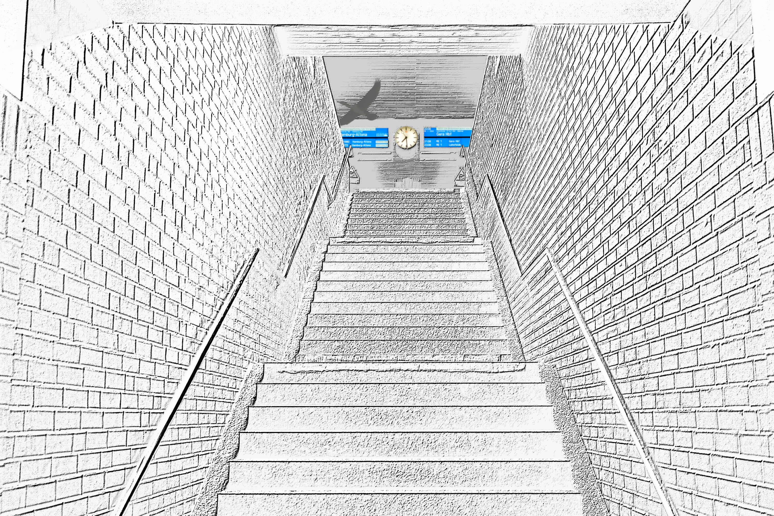 Photomontage, Treppe Bahnhof Göttingen und Kormoran