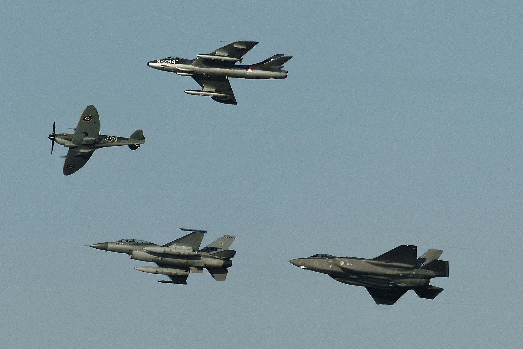 Während der Zeremonie ( First Aircraft Arrival ) flog die Lightning II in einer Formation mit ihren Vorgängern Spitfire,Hunter und Fighting Falcon eine Ehrenrunde. Die First F-35 Aircraft Arrival Formation.: - TB885 / 3W-V / Spitfire Mk.XVIe / 322 Sqn mks / Reg: G-CKUE - 'N-294' Hunter F.6A DHHF (Dutch Hawker Hunter Foundation) Reg: G-KAXF - J-065 F-16BM "Fighting Falcon" 322 Sqn - F-009 F-35A "Lightning II" no mks ( 322 Sqn )