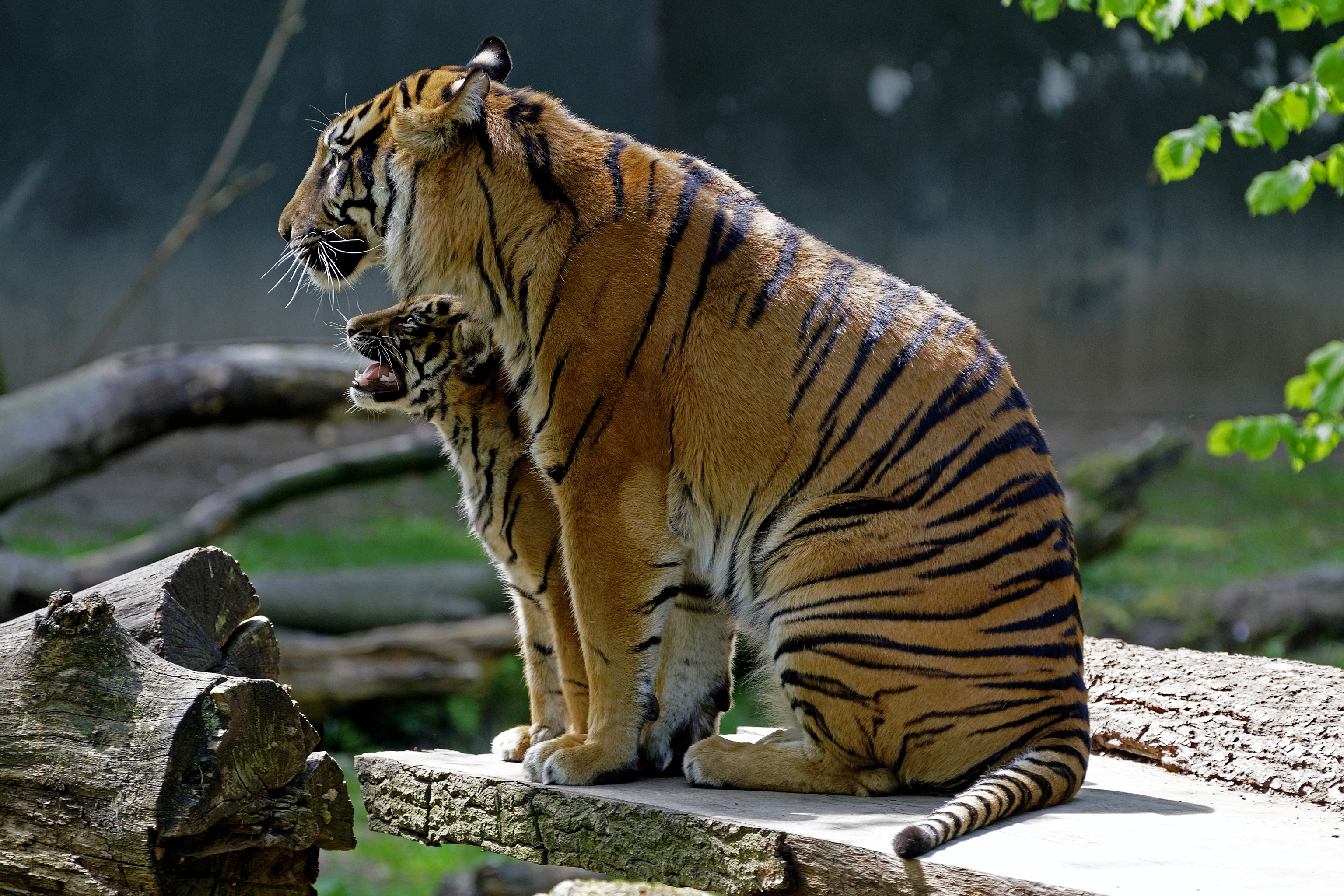 Naga mit eines ihrer Tigerdrillinge Leopold, Zuma oder Tipah. Lokation : NaturZoo Rheine / Freihand Aufnahmetechnik