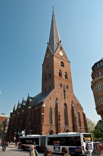 Von seiner Aussichtsplattform aus blickt man umgeben von Wasserspeier und gotischen Turmschmucks über die Hamburger Innenstadt, das Rathaus, die Alster, den Hafen, den Cruise Terminal, Speicherstadt und die neue Hafencity. Ein gläserner Panoramalift bringt die Besucher bequem auf die Plattform in 76 m Höhe.