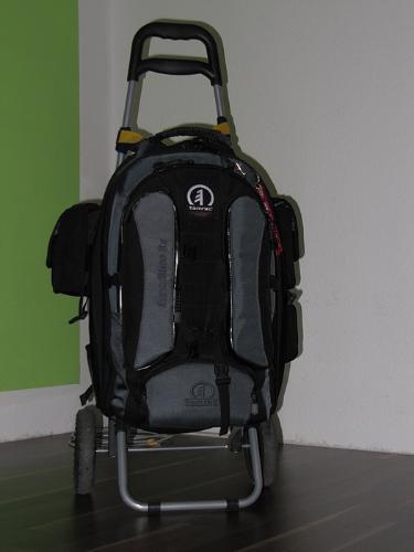 Ich mache das ähnlich. Ich habe den Kata 3N1-30 Sling Rucksack, den befestige ich ebenfalls auf einem Einkaufstolly. Mein Rucksack hat extra eine Befestigungsmöglichkeit dafür, allerdings rutscht er nicht ganz nach untenm, sitzt dafür aber auch richtig fest. So kann ich darunter noch einen Beanbag anbringen. Diese Kombination steht überraschend stabil. Selbst ein Anschubsen hat ihn noch nicht umgeworfen. Unser Trolly hat aber deutlich größere Räder und ein sehr ausladenden Standfuß.